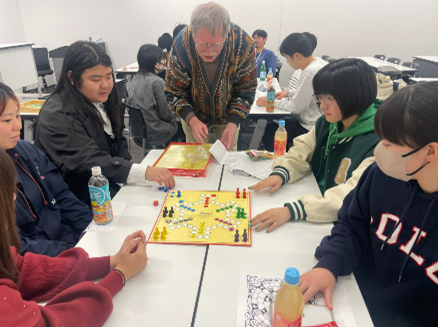 本ウィークは12月11日(木)、ワークショップ『ボードゲームでドイツを知ろう』で最終日を迎えました。最終日は、本学教養教育センター名誉教授 佐伯啓先生が研究されているドイツ伝統ボードゲーム『鵞鳥のゲーム(Gänsespiel)』の歴史とヨーロッパ内での伝播について「ドイツにおけるボードゲーム」のタイトルでご講演を頂きました。続いて、元本学教員E.フリードリッヒ・ゾンダーマン先生より「ドイツの家庭生活とボードゲーム」と題して、若かりし頃を振り返りながら、兄弟たちと共に和気あいあいとして行った社会性ゲームとしてのボードゲームの役割をドイツ語でご解説頂きました。