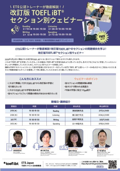ETS Japanでは、2026年1月21日(水)に開始される改訂版TOEFL iBTに向けて、学習者のみなさんが万全の準備を進められるよう、4週連続のセクション別ウェビナーを開催します。今回の改訂では各セクションに新たなタスクが導入されるため、これまでTOEFL iBTを学習してきた方はもちろん、これから学習を始める方にとっても、最新形式を理解し効果的に対策を進める絶好の機会となります。関心がある方はぜひご参加ください。