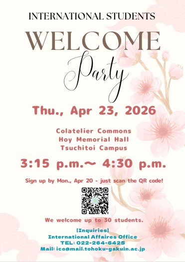 2026年4月から本学で学ぶ留学生の歓迎会を以下のとおり開催します。関心のある方はぜひお申し込みください。